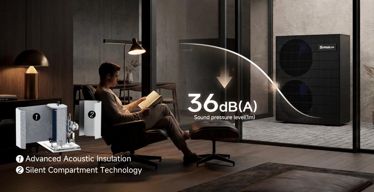 Nivelul de zgomot al pompelor de căldură variază în funcție de designul de proces al mărcii și de tehnologia de reducere a zgomotului. Directiva europeană ERP cere ca zgomotul nocturn al pompelor de căldură să fie de obicei în jur de 35-45 decibeli (A). Luând ca exemplu cea mai recentă pompă de căldură din seria R290 Geenergy EVO de la SPRSUN, aceasta a suferit mai multe runde de upgrade și transformări pe baza proceselor tradiționale de reducere a zgomotului, cu un zgomot minim de până la 36 dB(A). Chiar și în zonele rezidențiale pe timp de noapte, poate aduce utilizatorilor o experiență liniștită complet nouă.